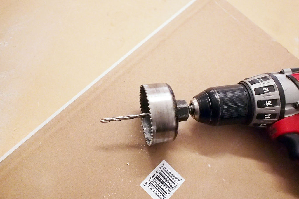 Держа дрель строго перпендикулярно поверхности, начните резать гипсокартон. Не прорезайте его насквозь!