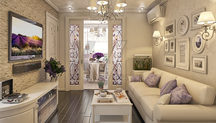 Для гостиной в стиле прованс будут уместны и обои под покраску, обладающие своеобразным тиснением, и пастельные полотна с мелким цветочным принтом, изящными узорами.