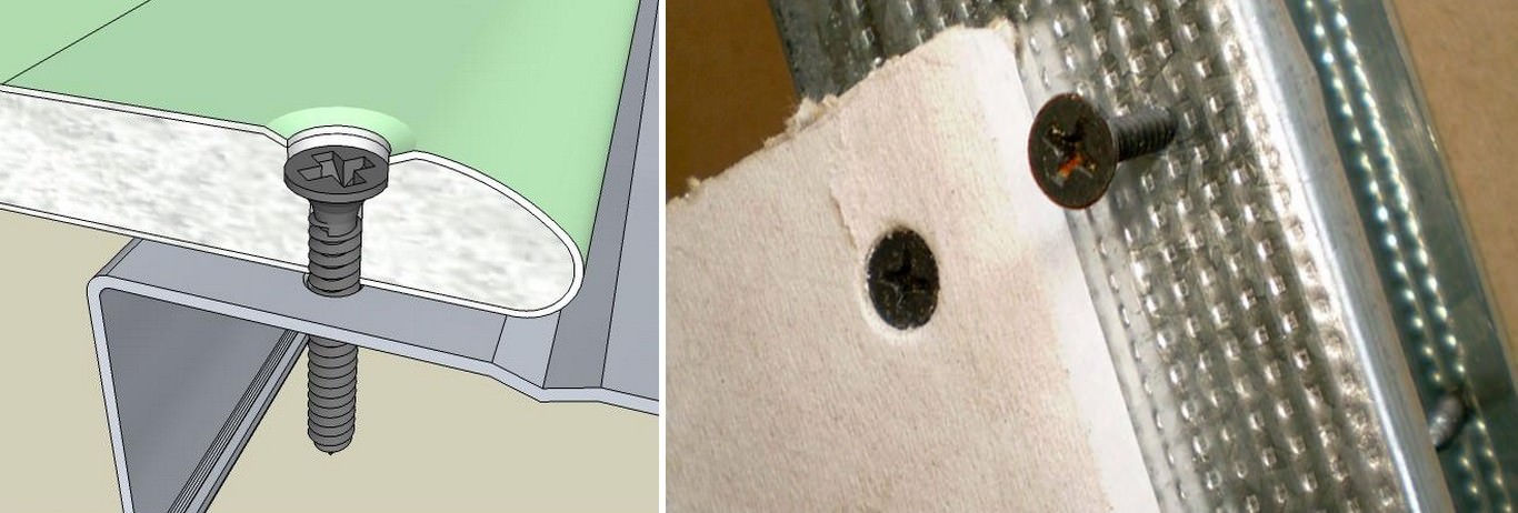 При монтаже следите за глубиной посадки саморезов, которая должна составлять от одного до полутора миллиметров. Это создаст прекрасные условия для применения шпаклевки, потому что правильно утопленные саморезы закроются и не заржавеют. При этом слишком глубокая посадка порвет материал, вследствие чего конструкция крепления ослабнет.
