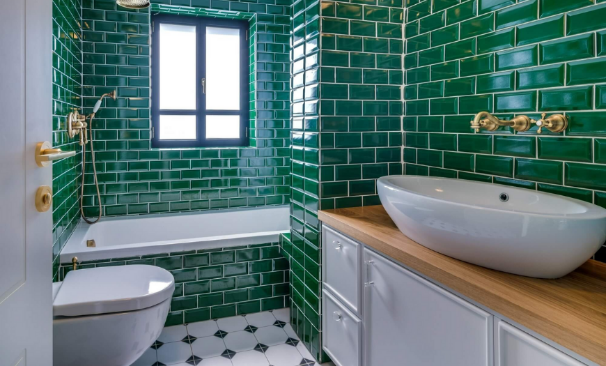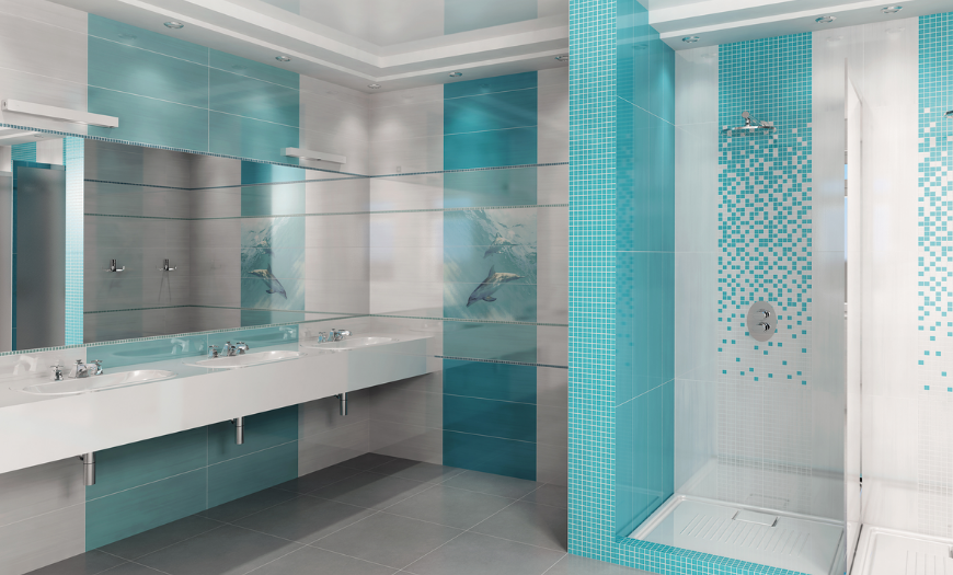 Оттенок ассоциируется с природой и олицетворяет свежесть, чистоту. Прекрасно выглядит ванная, отделанная плиткой бирюзового или цвета морской волны. Сочетать можно с белым, желтым, кремовым.