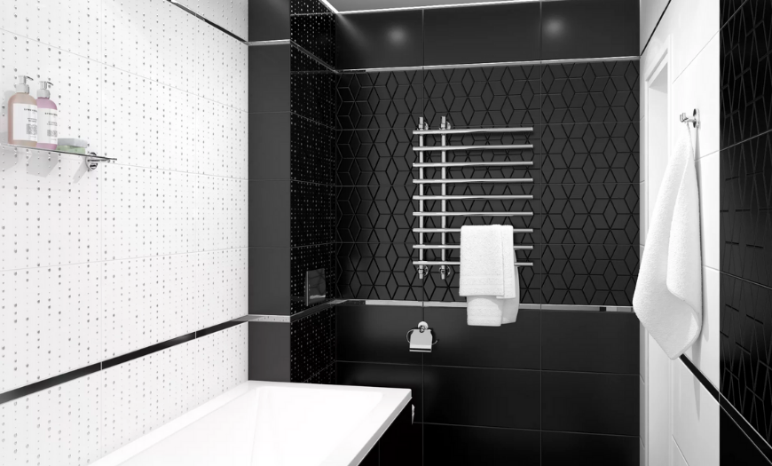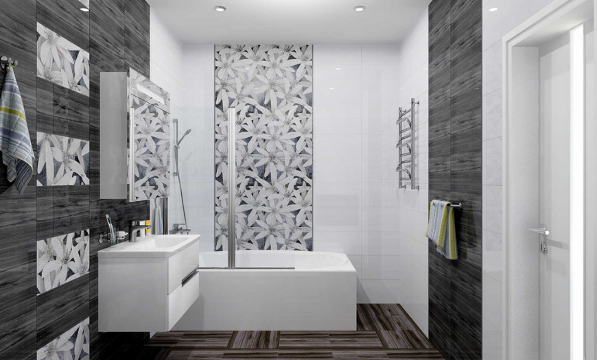 Чтобы проиллюстрировать это более наглядно, давайте рассмотрим пример — предположим, вам нравятся белые плитки с серо-коричневыми и черными цветочными орнаментами. Сначала такой мотив может показаться слишком подавляющим в крошечной ванной комнате.