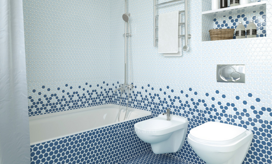 Этот способ подходит для просторных ванных комнат, при этом можно сочетать мозаичный кафель с обычным, гладкий с рельефным в различных цветовых сочетаниях, важно соблюдать гармоничность орнамента и продуманность комбинации
