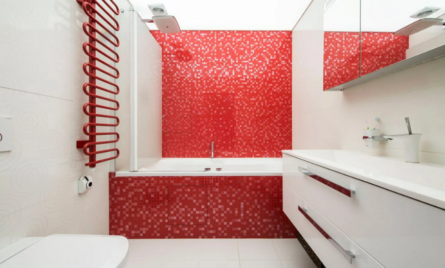 Красивый тон, но не отделывайте ванную только им. Сочетайте с белым, бежевым, синим, фиолетовым, оранжевым, серым.