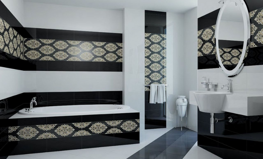 Рисунок или орнамент на кафельной облицовке придает интерьеру оригинальность, но в маленькой ванной комнате создавать крупные красочные панно не рекомендуется, так как это еще сильнее уменьшит объем. В таких помещениях можно разместить неяркий рисунок из плиток по размеру, не отличающихся от основного кафеля. В целом предпочтение отдается не большой картине на стене, а маленьким узорам на каждой плитке. Модный тренд — ретроорнамент. Последние модели выпускаются с орнаментом, популярным в 50-ые годы прошлого столетия. Пользуются успехом итальянские, испанские, марокканские народные узоры и орнаменты.