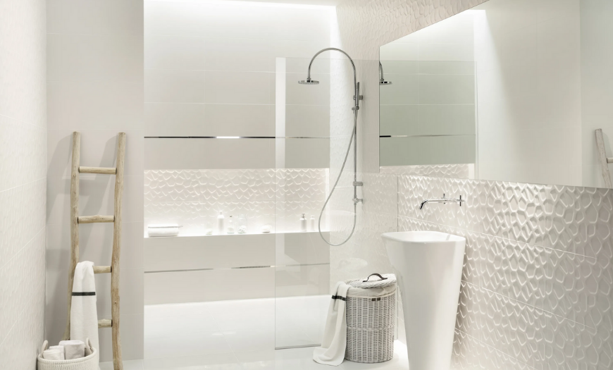 Белоснежный фон – это классика, помогающая зрительно увеличить пространство. Чтобы интерьер не был скучным, добавьте несколько темных или ярких акцентов. Необязательно применять кристально белую плитку, можно заменить ее бежевой, жемчужной, молочной.