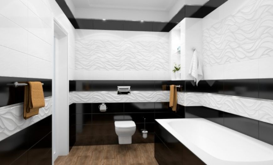 - Качество поверхности. Обычно настенная плитка изготовляется с глянцевым покрытием. Такую модель удобно мыть, на ней легко удаляются капли грязи, мыла и разводы. Идеальный вариант – ребристая мозаичная поверхность. Она решает все проблемы эстетики в ванной комнате. Что касается напольного покрытия, то он должен быть матовым, иначе поверхность будет скользкой, а со временем потеряет блеск.
