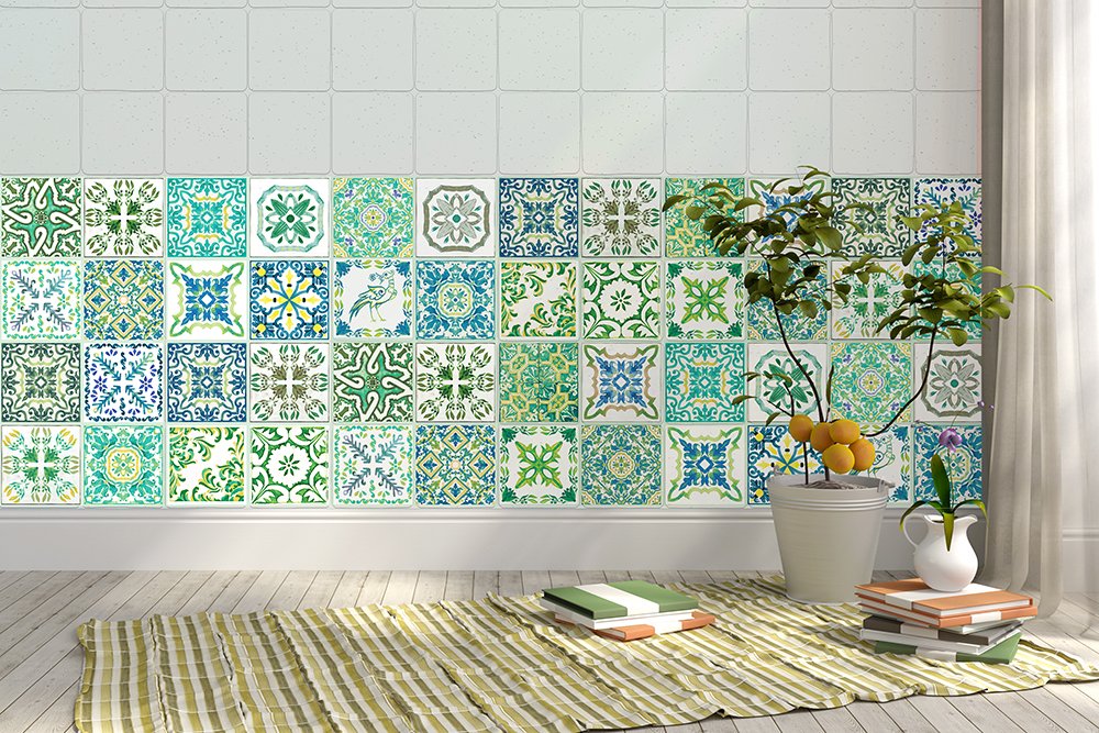 Если речь идет о художественно глазурованной плитке (например, португальской азулежу или декоративных фаянсовых пластин для облицовки), то ей можно выложить небольшой участок стены, покрытый другим материалом, например, штукатуркой или обоями