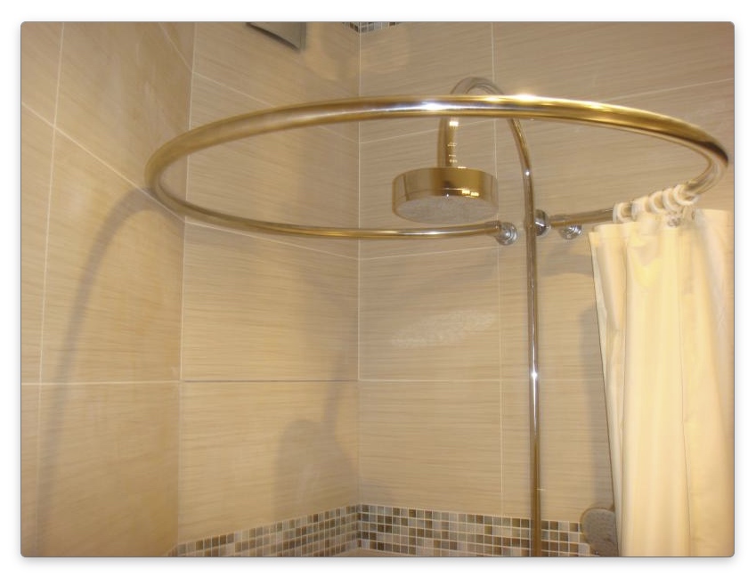 Немалой популярностью сегодня пользуются круглые карнизы, которые также можно установить в углу комнаты над поддоном душа. Они применяются для отделения места купания и эффективно защищают помещение от брызг воды во время принятия водных процедур. Алюминиевые стержни монтируются с дюбелями к боковой стене ванной комнаты, наиболее часто используемый диаметр трубы — 20 и 28 мм. Крепежный элемент обеспечивает очень высокую стабильность фиксации стержня. Цвет дуги можно выбрать в следующих вариантах: