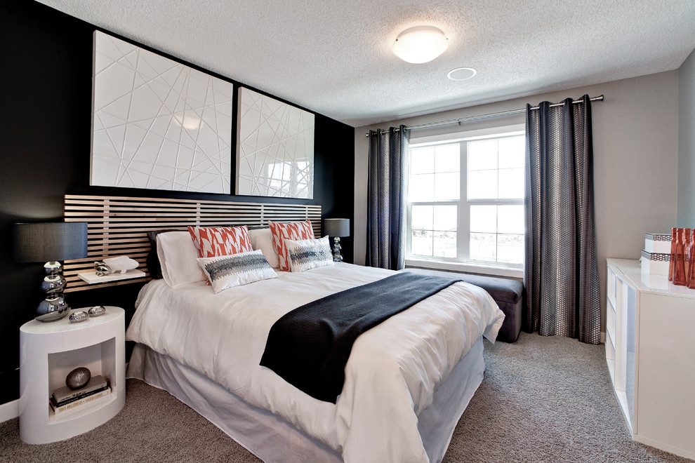 Темный потолок в сочетании с такими же стенами создаст иллюзию высоты. Это обусловлено тем, что границы стен и потолка становятся невидимыми. А при таком положении комната будет казаться больше. Черный потолок добавит обстановке драматичности и таинственности, придаст архитектурную изюминку и сделает все пространство более интересным. Как вариант, можете прибегнуть к приему «двойное эхо» – выкрасите потолок и пол в черный цвет. Это станет интересным сочетанием со стенами, украшенными черно-белыми обоями с изображением вензелей.