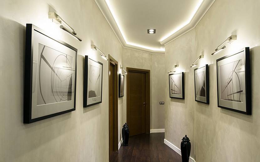 - Большинство коридоров страдают недостатком естественного освещения, поэтому будет правильным организовать для картин подсветку. Это может быть как специальная светодиодная подсветка, так и обычные настенные бра. Чтобы изображение не выгорало, его защищают антибликовым стеклом.