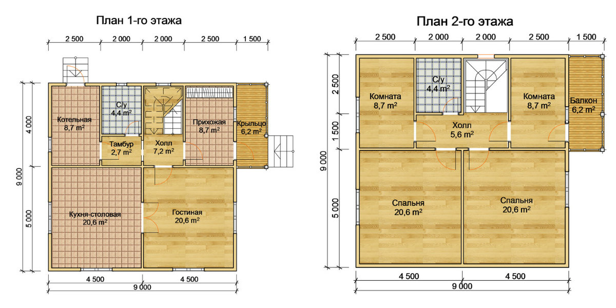 Необходимо отметить, что в двухэтажном строении часть внутренней площади будет отведена под межэтажную лестницу и лестничные площадки. То есть территория нижнего этажа маленького дома получается значительно меньше.