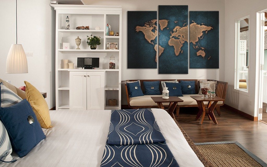 - Полки над диваном смогут заменить громоздкие шкафы;