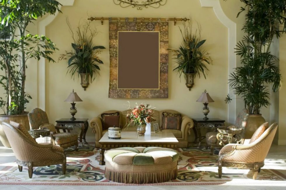 Солнечный средиземноморский интерьер с элементами грубоватой античности наполняется особым очарование, когда в нем поселяются южные цветы и растения – комнатные кипарисы, папирус, олеандр, плющ, розы и др.