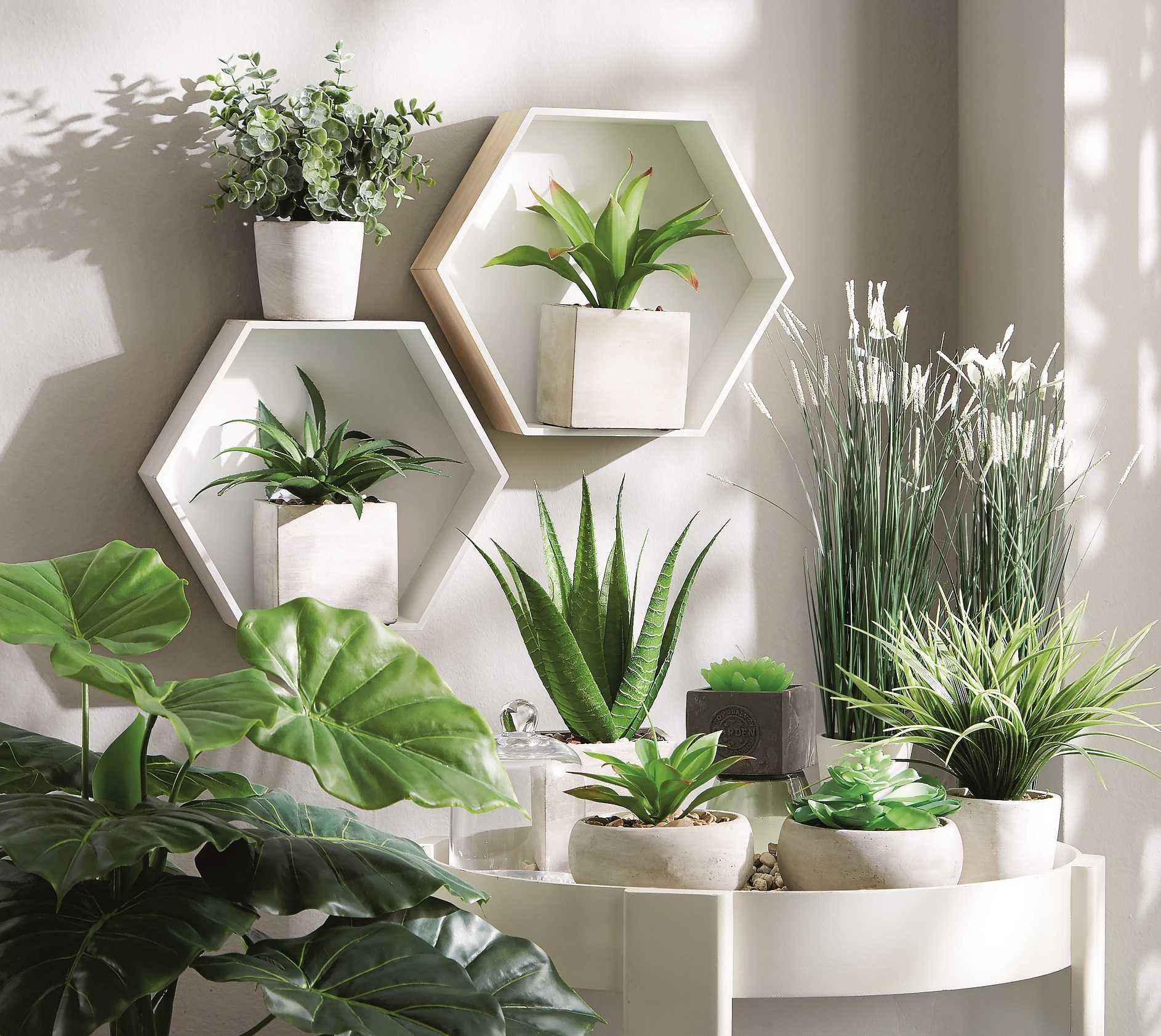 Искусственные цветы в интерьере Искусственные цветы и новогодние шарики в интерьере Искусственная трава в горшке для украшения квартиры Высокое искусственное растение в горшке Декоративный водопад и искусственные растения в интерьере ванной