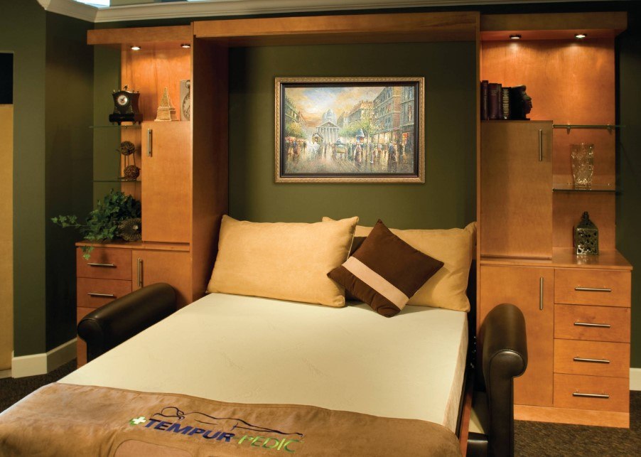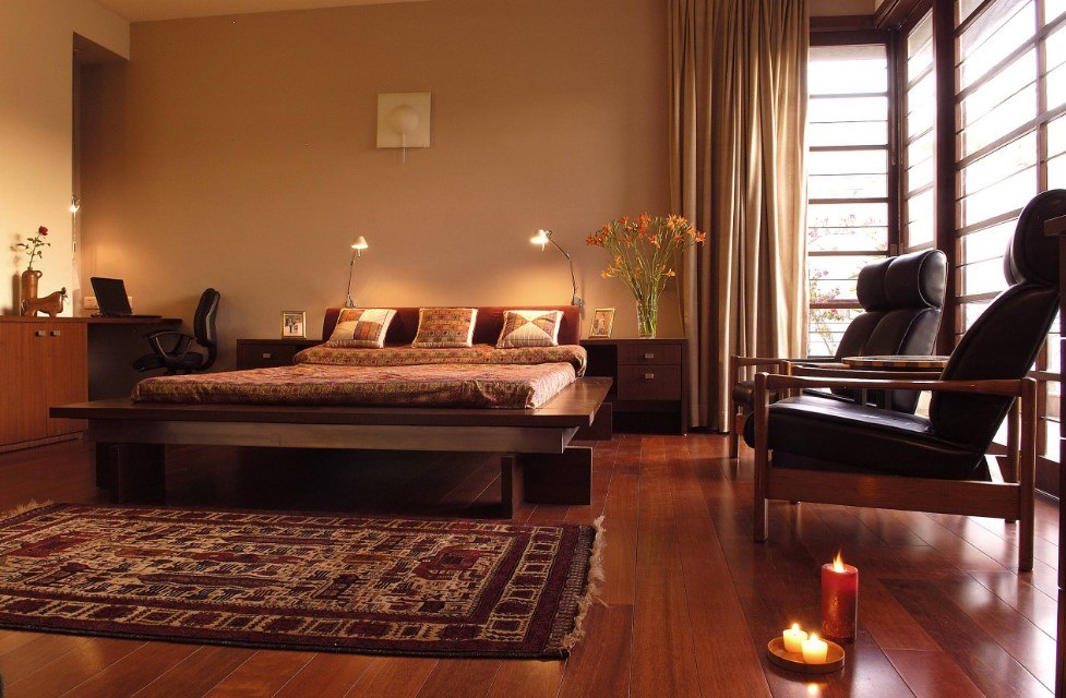 Отдельного упоминания стоит мебель, появляющаяся в контексте такой спальни. Старайтесь выбирать или устойчивые сочетания, или и вовсе мебель одного типа (например, строго орех или венге). Можно комбинировать венге и какао, допуская третий акцентный цвет в колористическую концепцию. Правильно комбинированные цвета мебели дают строгость и эмоционально правильное восприятие. Комната же, где синий сочетается с золотым, а мебель в ней разных оттенков коричневого, смотрится аляповато, что можно назвать дизайн-рассинхроном.