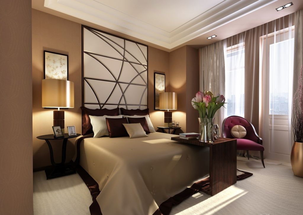 Например, отделка беж, шторы и покрывала – яркие или шоколадных тонов, но лучше текстиль подобрать в тон стен, для изюминки, с узором. Большие спальни можно смело декорировать контрастным текстилем.