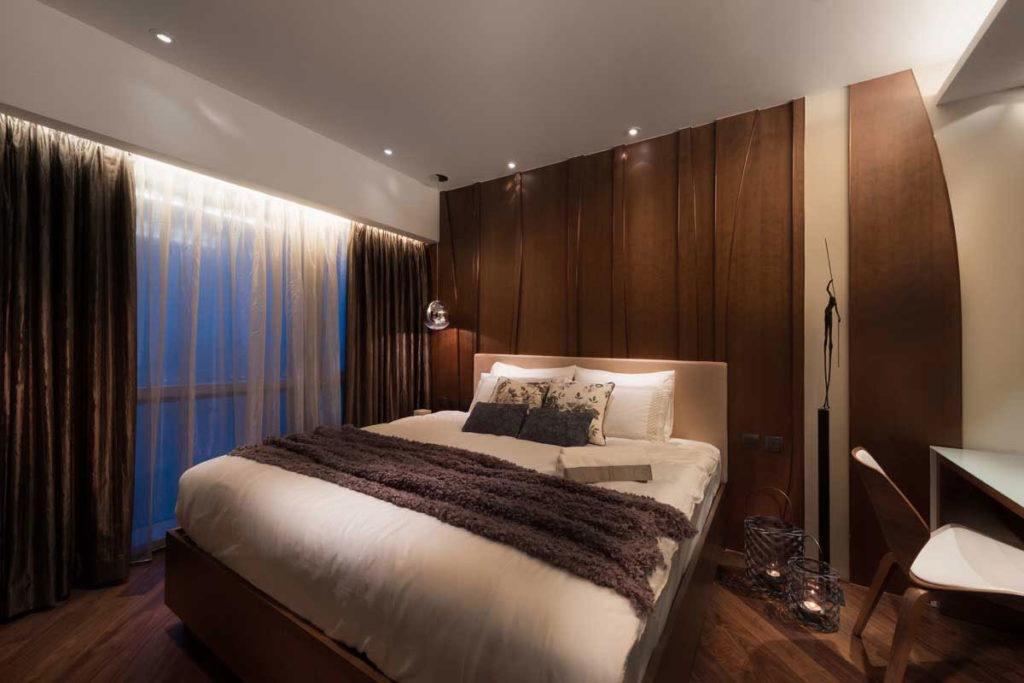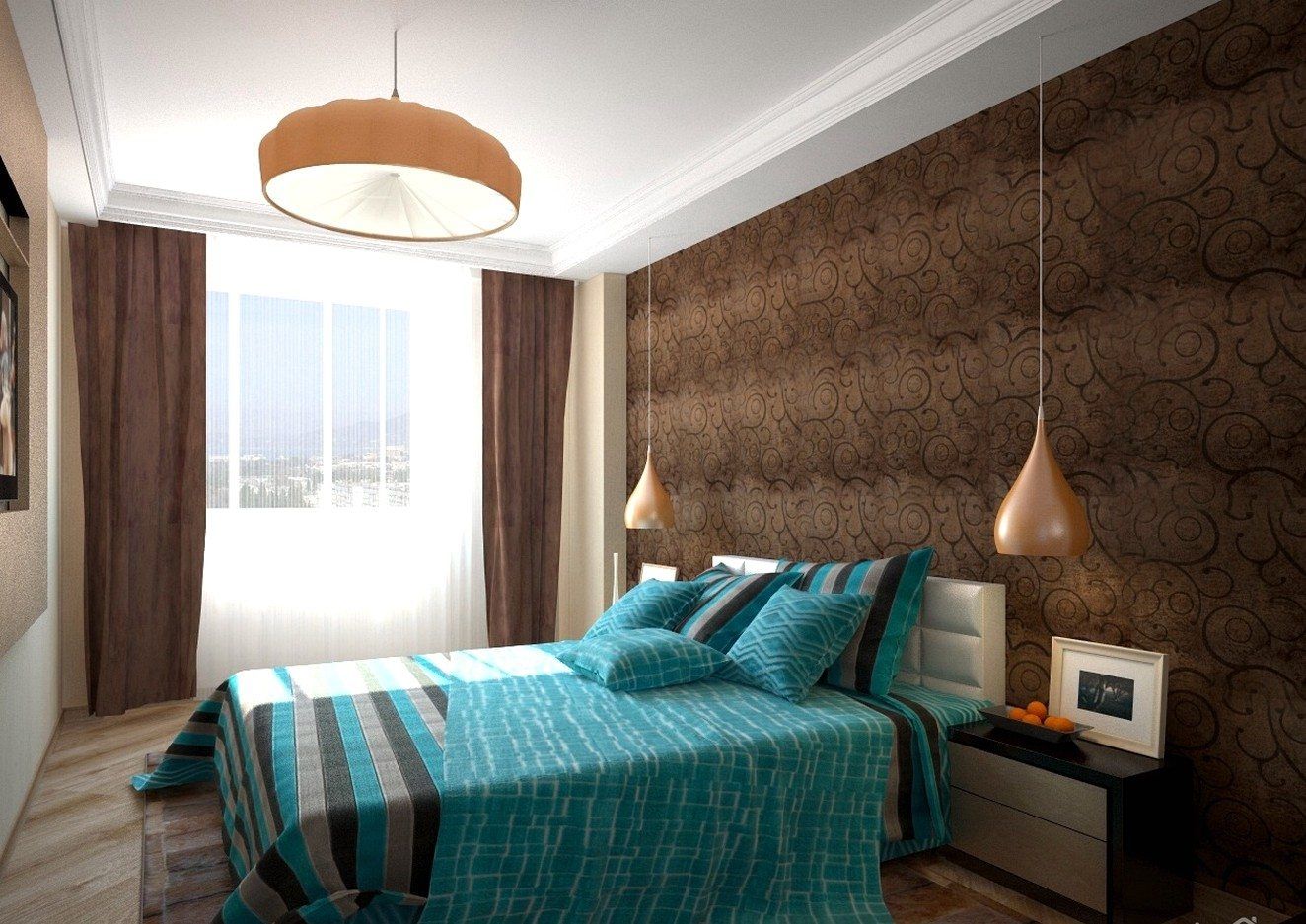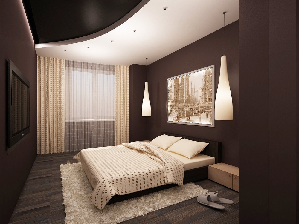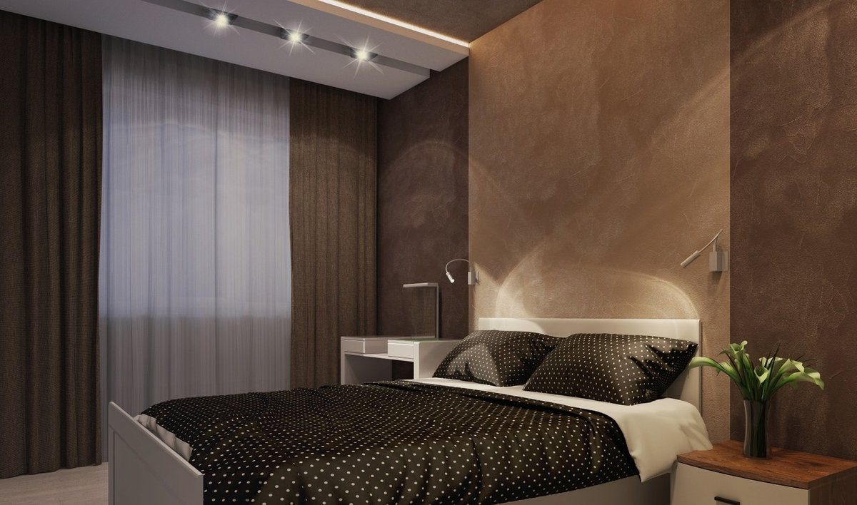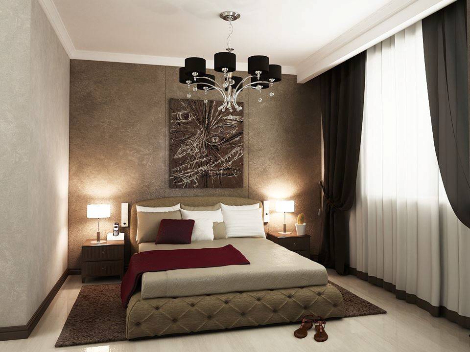 В коричневом оформлении важно правильно расставлять акценты и чередовать цвета. В маленькой спальне светлый должен преобладать, а темные тона служить акцентами. Например, отделка беж, шторы и покрывала – яркие или шоколадных тонов, но лучше текстиль подобрать в тон стен, для изюминки, с узором