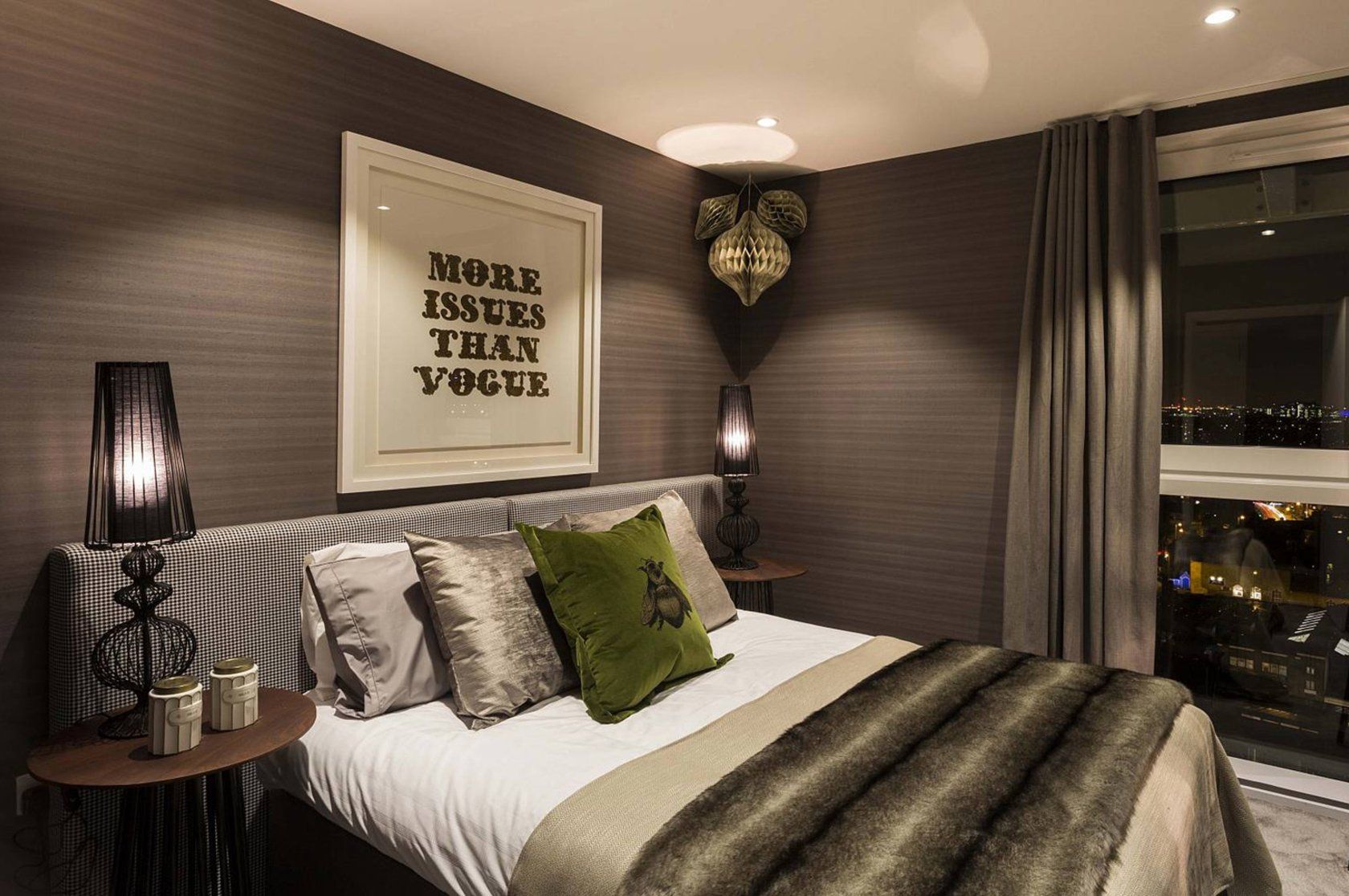 - сочетание бежевого с насыщенным шоколадным и зелеными акцентами позволяет создать оптимальную обстановку для полноценного сна, избавления от стрессов;