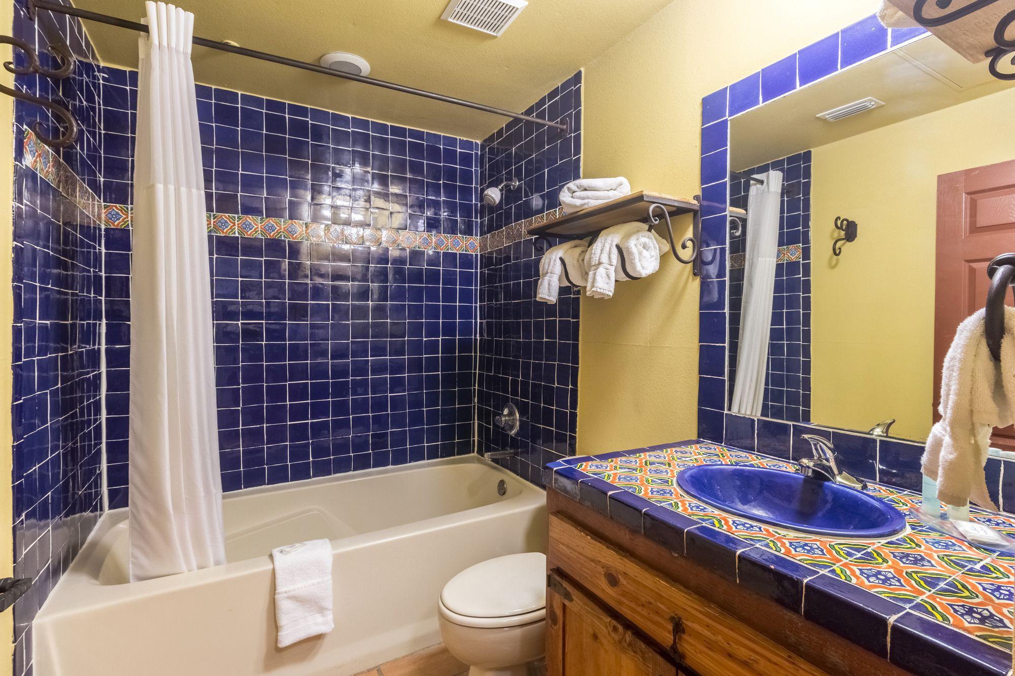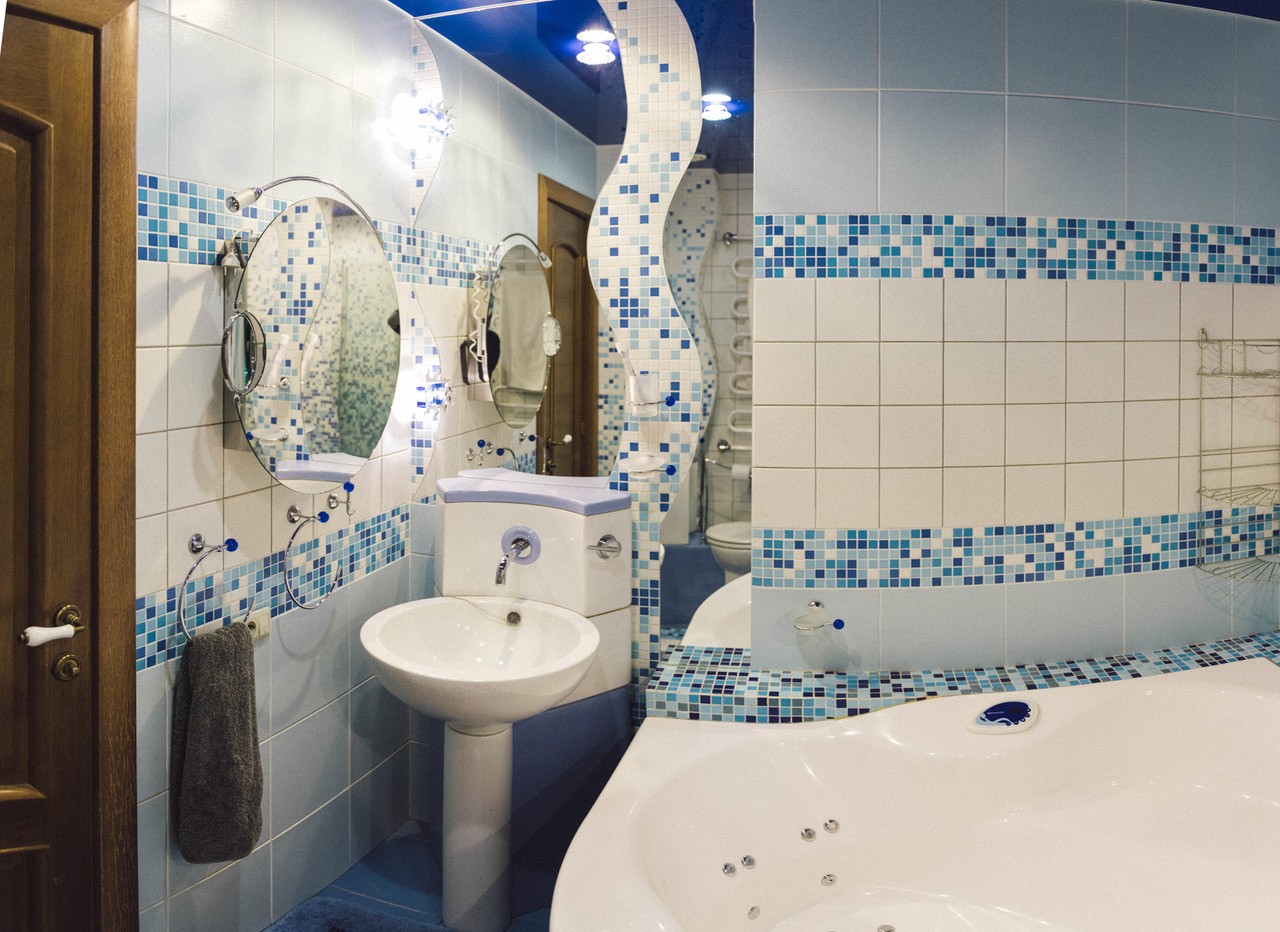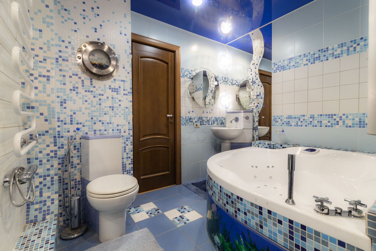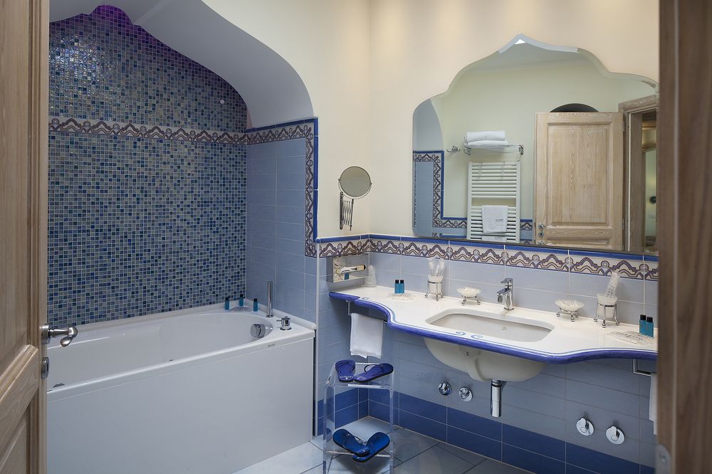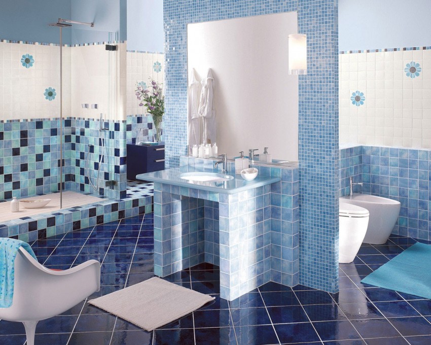 Восточный стиль предполагает мозаичные орнаменты с этническими мотивами. Синий будет хорошо смотреться в сочетании с жёлтым, оливковым. Сантехнику можно выбрать бежевого цвета