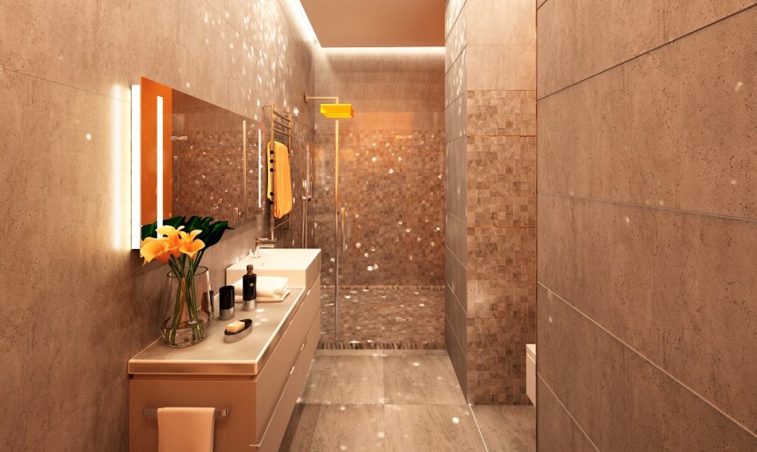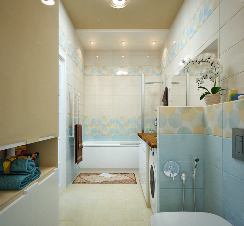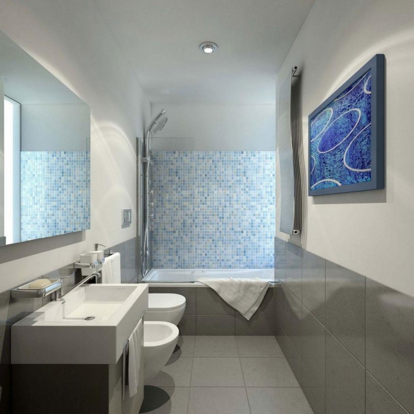 Во избежание эффекта «коридора», узкое помещение можно разбить на зоны: рядом с унитазом и/или раковиной уложить мелкую мозаику, а вдоль ванны — более крупные элементы похожей расцветки, или наоборот. Плитку лучше выбирать квадратную, 6- или 8-угольную.