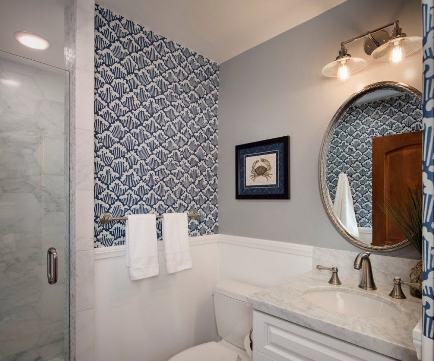 Неплохим решением для ванной будут влагостойкие жидкие обои. С их помощью также можно расширить пространство, если структура обоев будет не крупной.