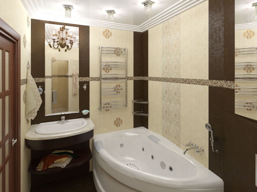Сочетание коричневого и белого цвета создаёт действительно привлекательный контраст, который придётся по душе как любителю классики, так и оригиналу. Дело в том, что комбинация подобных тонов придаст вашей ванне праздничную атмосферу благодаря интересному и нарядному сочетанию.