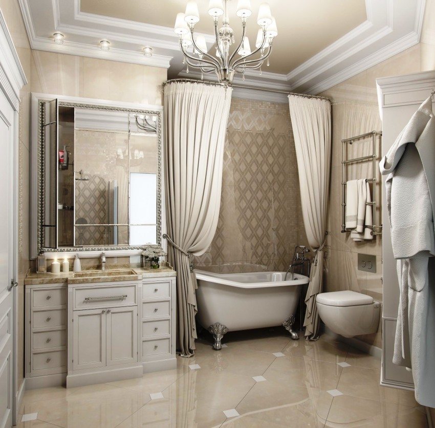 Не менее важным является освещение. Хрустальная люстра, незатейливый плафон или люминесцентные лампы – зависит от выбранного стиля и эффекта, которого вы хотите достигнуть. Не забудьте о подсветке зеркал и шкафчиков.