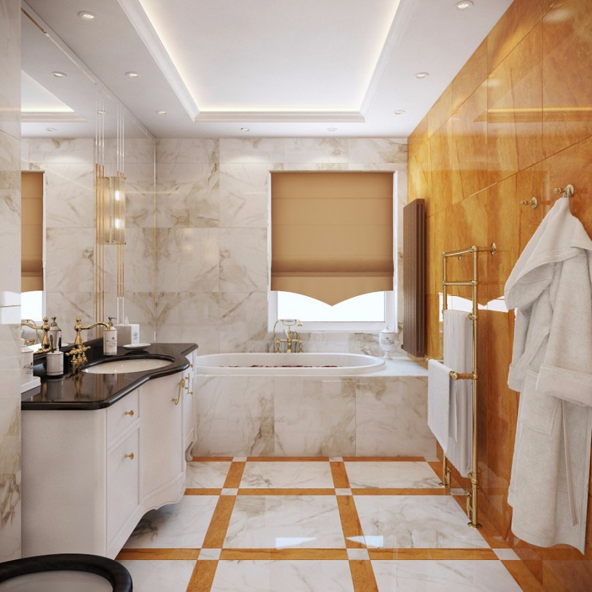Дополните интерьер раковиной белого цвета — хорошо будет смотреться круглая модель столешницы. Выберите элегантный смеситель золотистого цвета, который будет сочетаться с теплыми цветами, использованными в дизайне. Выбирайте отдельно стоящую ванну из доломитового конгломерата — ее преимущества включают уникальный блеск и механическую прочность.