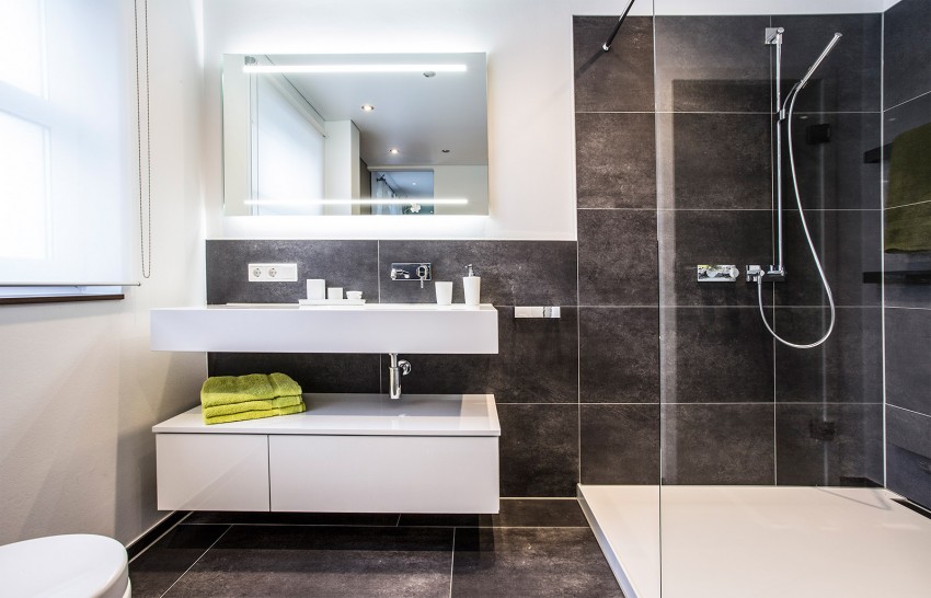 Дальше – мебель. Если вы решили придать акцент сантехнике – подойдет темная обстановка