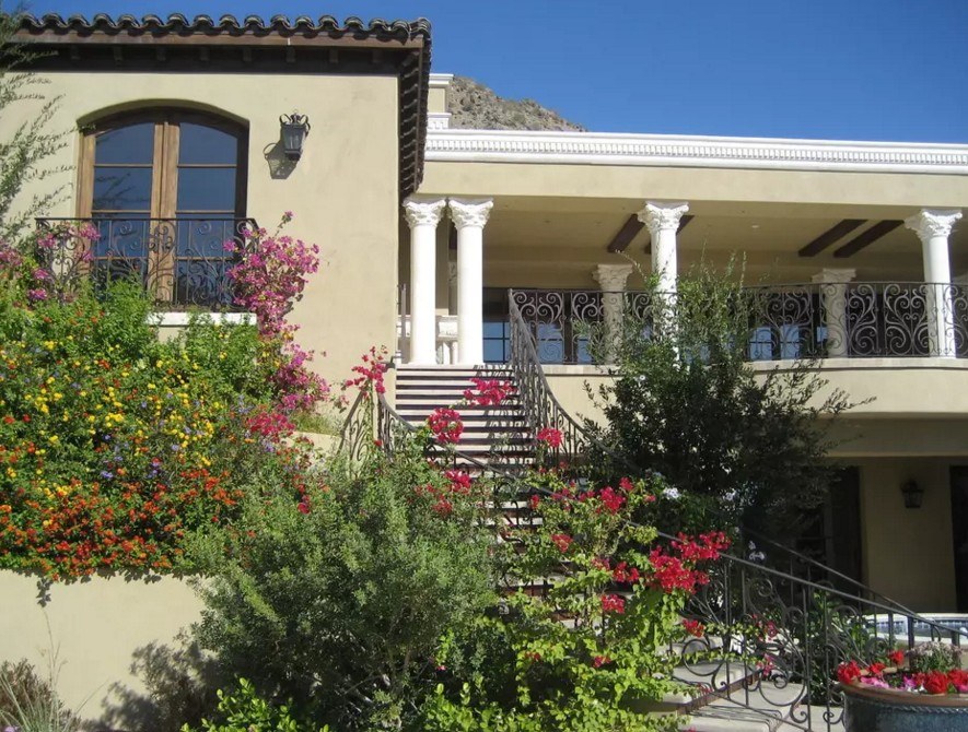 Если Вы использовали кованые балконы в экстерьере загородного дома, то его можно дополнить плетеной мебелью, садовыми фонарями и душистыми цветущими растениями — все это поможет Вам создать атмосферу уюта