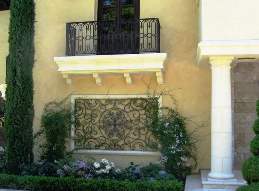 В качестве дополнительного декора используются рисунки виноградной лозы. Этот флористический мотив также популярен, как и миниатюрные цветочные корзины. Для того чтобы разместить настоящие растения на балконе, снаружи делают кованые полукруглые вставки. В них ставятся горшки с живыми цветами.