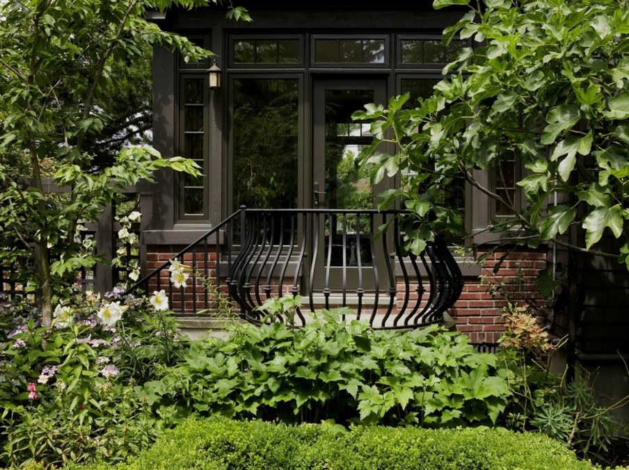 Часто хозяева дома, для того чтобы создать утонченный дизайн и завершить свой замысел, дополняют экстерьер дома этажерками, стойками для комнатных растений, подсвечниками, а также элементами кованой мебели