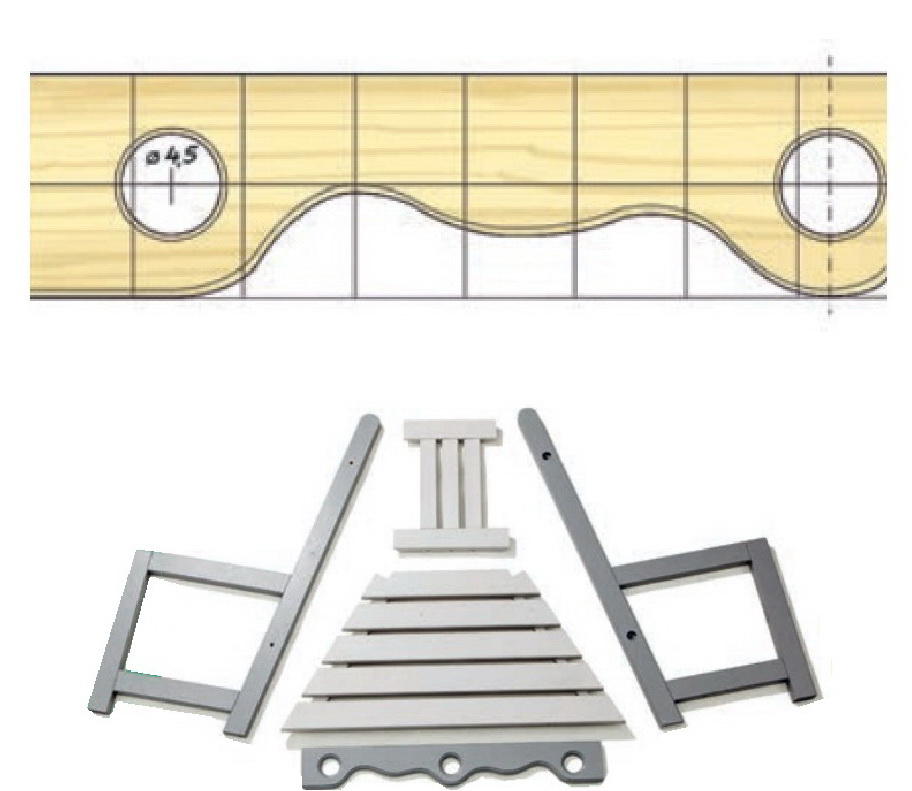 Для работы понадобятся лекала декоративных деталей, можно воспользоваться нашим вариантом или самостоятельно разработать форму. Представленная скамья подойдет для деревьев со стволом толщиной до 45–50 см!