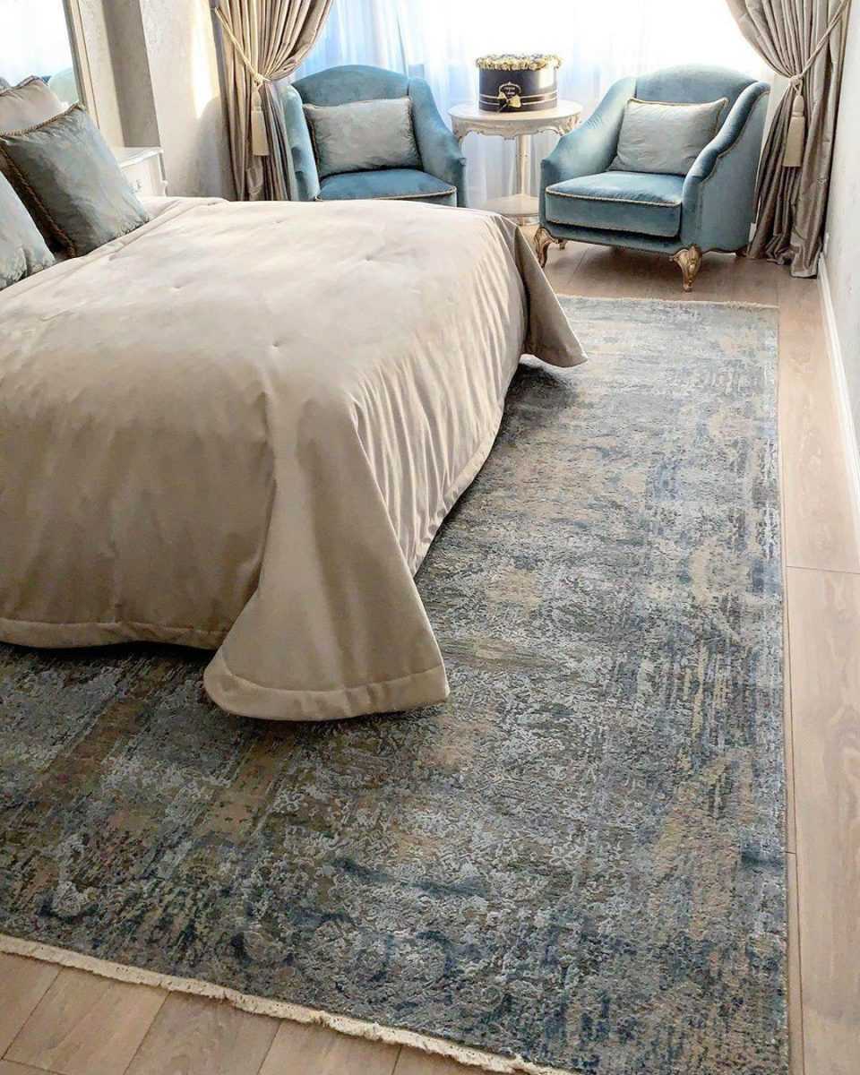 - Классическая. Подразумевает укладку ворсового покрытия вдоль спального места. Располагать ковер в спальне под кроватью требуется так, чтобы он выходил за неё и с обоих боков, и со стороны изножья. Это традиционное решение особенно уместно в комнатах, оформленных в стиле классики.