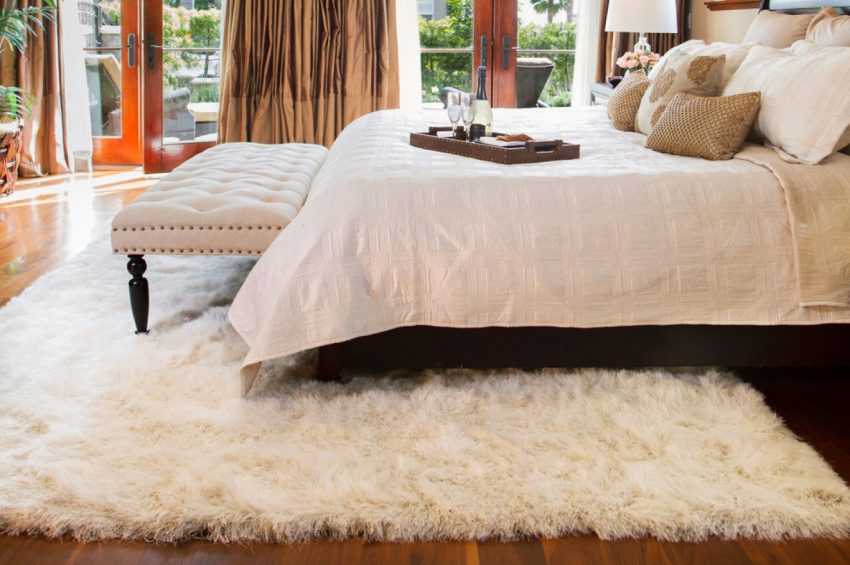 - Пушистым. Изначально подобные предметы предназначались для оформления спальных комнат. Их отличает сложность ухода. Но поскольку опочивальня не относится к быстро загрязняемым местам, в её интерьере можно часто встретить самые разные покрытия с длинным ворсом.