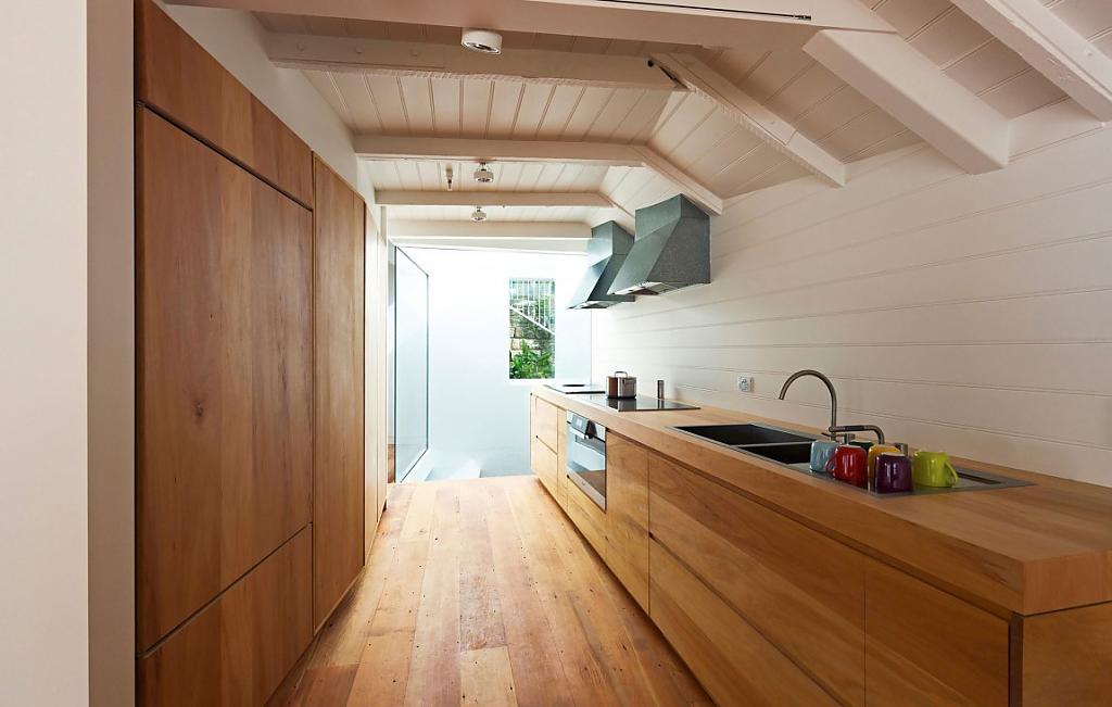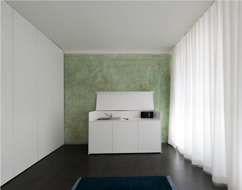 В процессе организации кухни в небольшом помещении может не хватить места для какого-либо предмета, к примеру, для обеденного стола. Но и тут находчивые дизайнеры решили вопрос и придумали стол, состоящий из модулей. В проекте на следующем фото кухня площадью 3 кв. метра после переделки интегрирована в гостиную комнату, а элементы стола могут легко передвигаться вдоль окон. При необходимости их объединяют в обеденный большой стол или раздвигают на 3 компактных: для перекусов, кухонный, письменный.