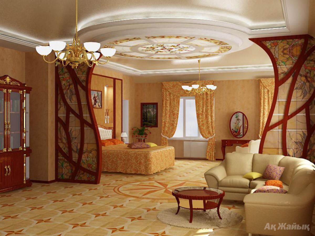Здесь же, наоборот, преобладает классический стиль. Спокойные пастельные тона, интересная конструкция многоуровневого потолка, искусно продуманная система освещения.
