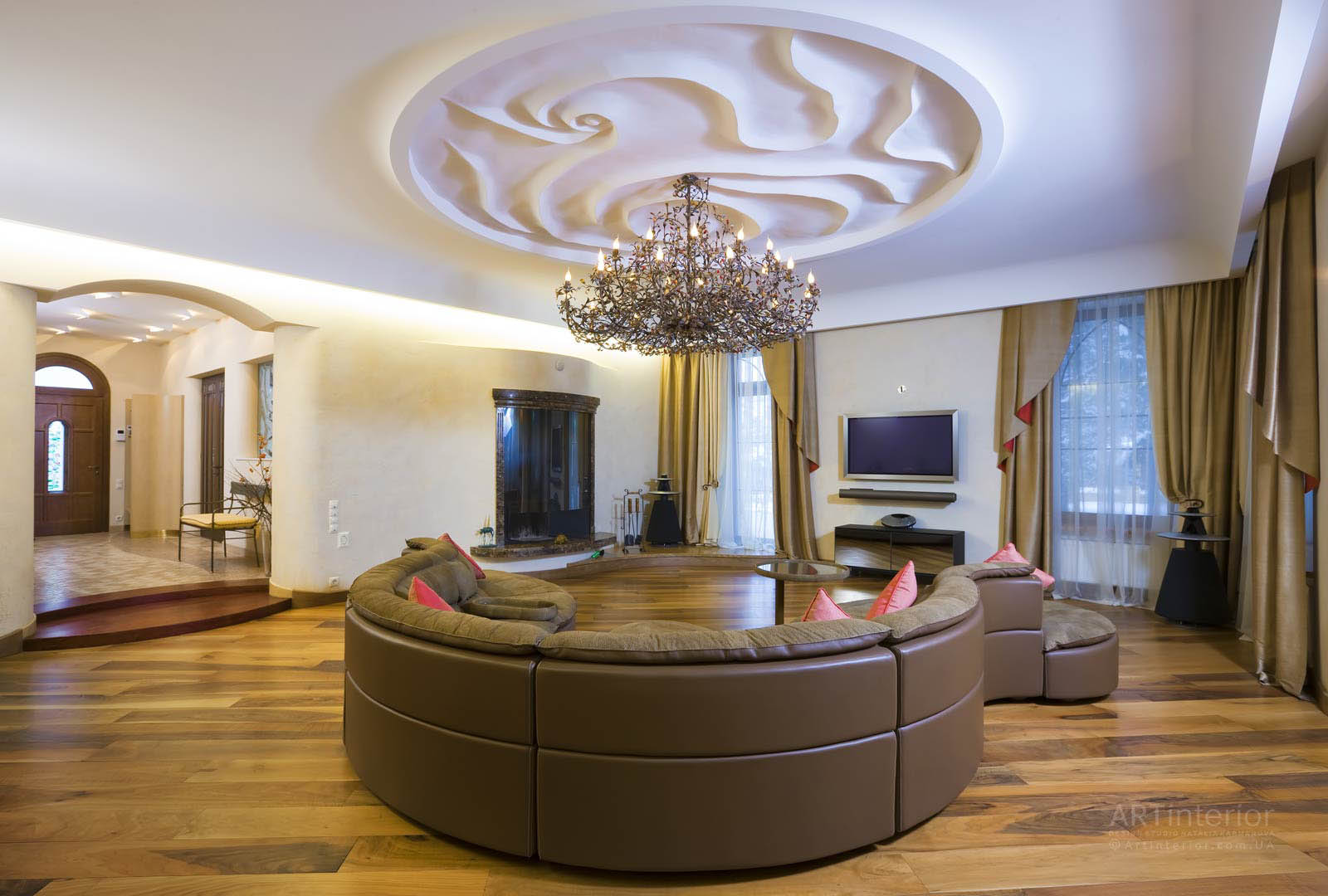Гипсокартонный многоярусный потолок образует единый гармоничный комплекс с отделкой стен и устройством пола. Особенно эффектно сочетание разноуровневых подиумов и фигурами 2 и 3 уровня с подобными очертаниями. Такой вариант возможен именно в частном доме и очень эффектен.