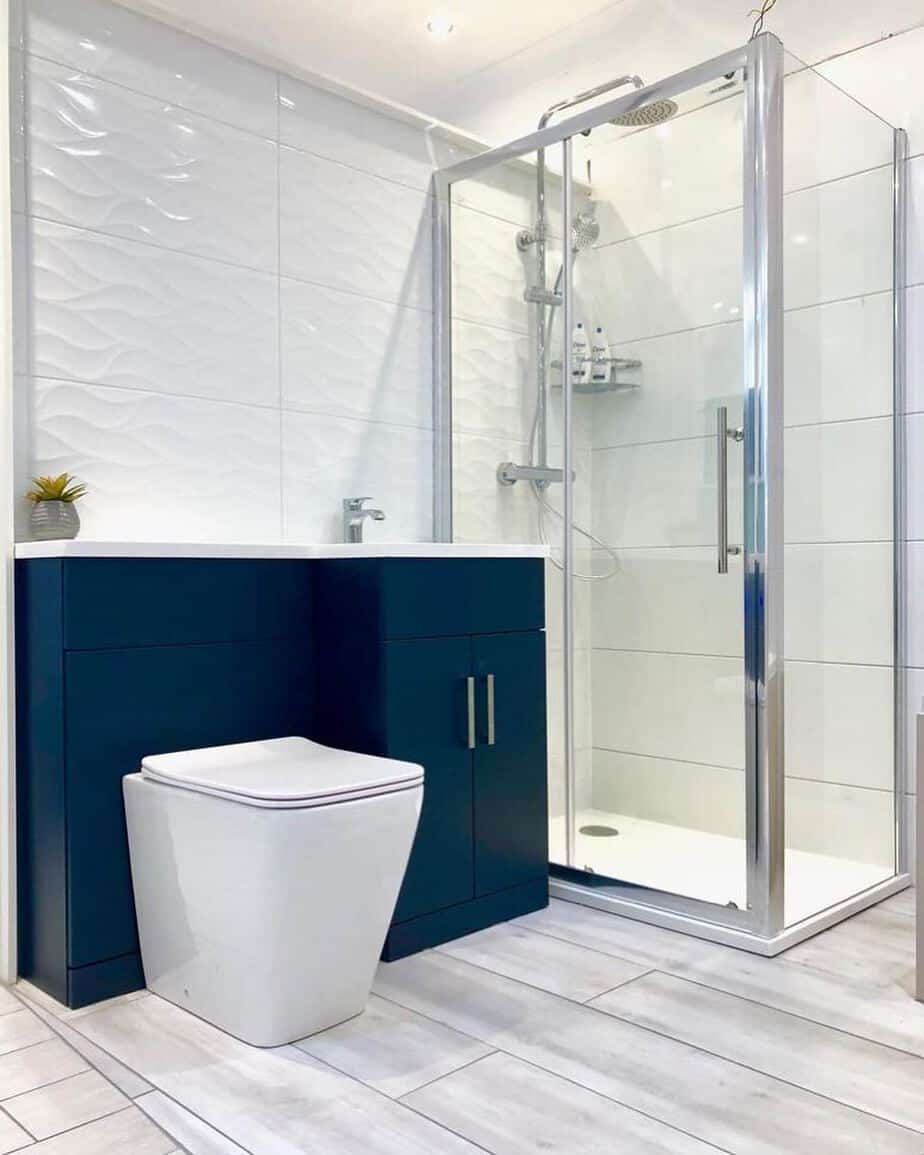 - Светлые оттенки синего. В душевой принято расслабляться, сбрасывать все негативные эмоции, накопленные за рабочий день. Психологи утверждают – все светлые оттенки синего положительно влияют на психику. Они успокаивают, настраивают на отдых.