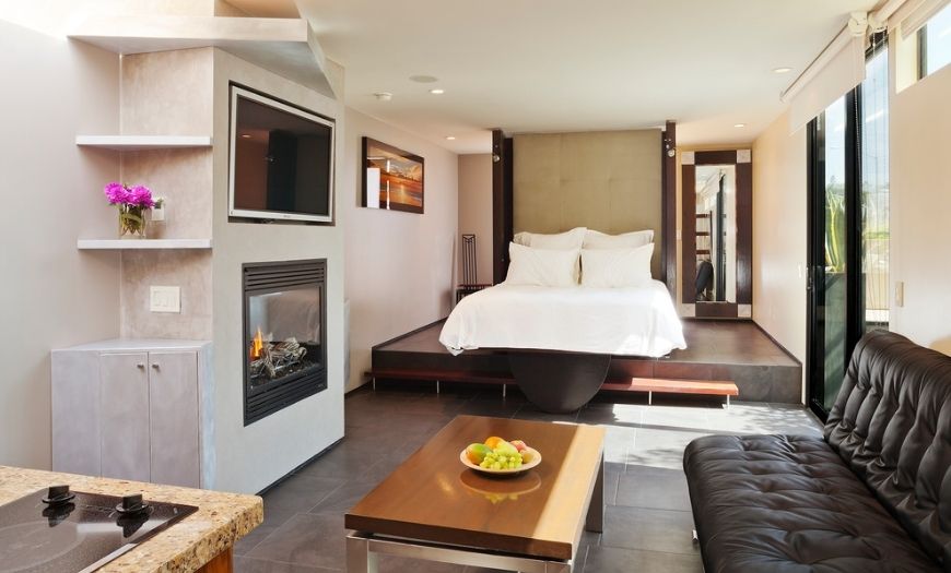 Использование данного стиля делает студию более светлой и просторной, поэтому он лучше всего подходит для маленьких квартир. Добавить интерьеру самобытности поможет заказная мебель из природных материалов, украшения из натурального камня и дерева, редкие комнатные растения.