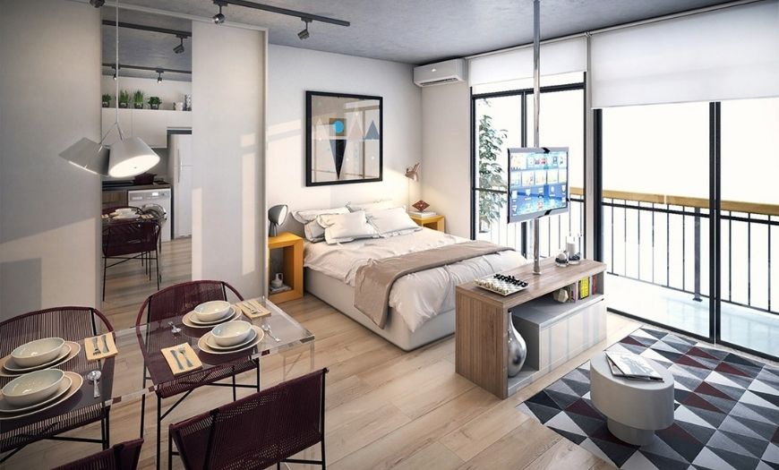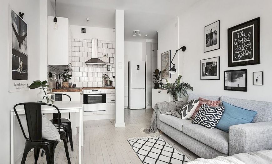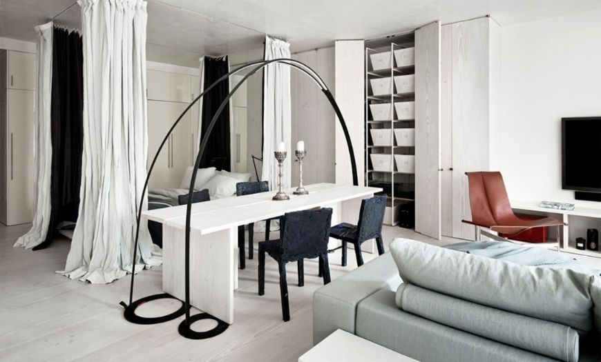 Квартиру-студию нужно разделять на зоны ненавязчиво. Не стоит огораживать их друг от друга плотными перегородками или выделять яркими цветами. Все области должны гармонично сочетаться и плавно переходить друг в друга, образуя единый интерьер.