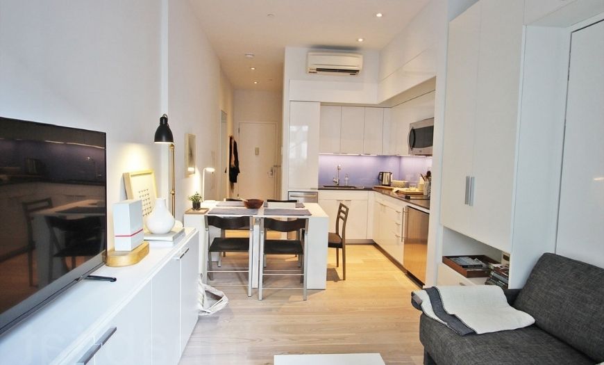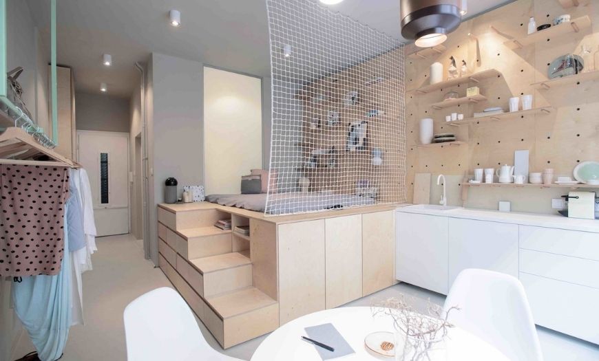 Отличается использованием современных высокотехнологичных материалов, компактной многофункциональной мебели, изделий-трансформеров. Цветовая гамма мягкая, приглушенная, линии плавные, округлые. Декор минималистичный, аксессуары выполняют практическую функцию. Все эти особенности делают стиль идеальным для оформления небольших помещений, включая квартиры-студии.