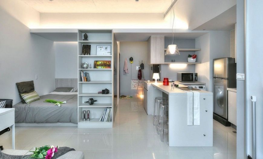 Выполнять функцию зонирования могут крупногабаритные предметы мебели. Классический пример — диван, разграничивающий зоны гостиной и спальни или кухни. Хорошим выбором станут различные шкафы и полки.