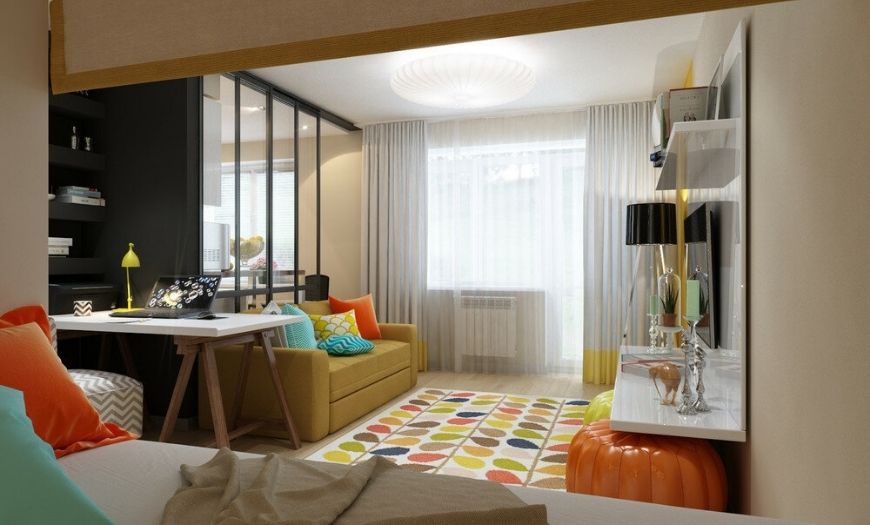 Шторы, будь то текстильные занавески или каркасные жалюзи — классический инструмент для зонирования. Легким тюлем можно оградить зону гостиной. Плотные шторы с дополнительной шумоизоляцией, например, японские или бамбуковые, хороши для спальни или рабочего места, где важны тишина и покой. Дополнительно зоны можно разграничить специальными перегородками из стекла или дерева, но они сложны в монтаже и стоят дороже, чем занавески.