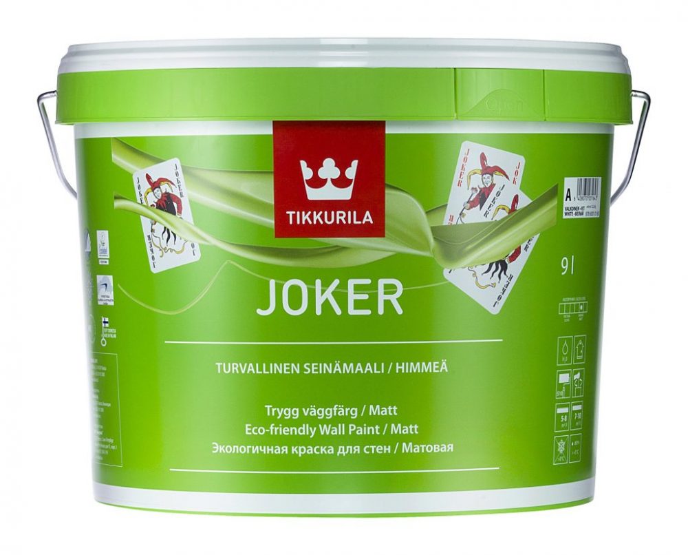- Tikkurila. Главным достоинством этой краски является большой ассортимент, многие составы поставляются в разведенном виде. Эти материалы гипоаллергенны, обладают хорошей паропроницаемостью и грязеотталкивающими свойствами. Выпускаются в упаковках на 18, 9, 2,5 и 0,9 л. К недостаткам продукции этой фирмы можно отнести высокую цену и необходимость профессиональной колеровки. Применяют в сочетании с другими материалами Tikkurila.