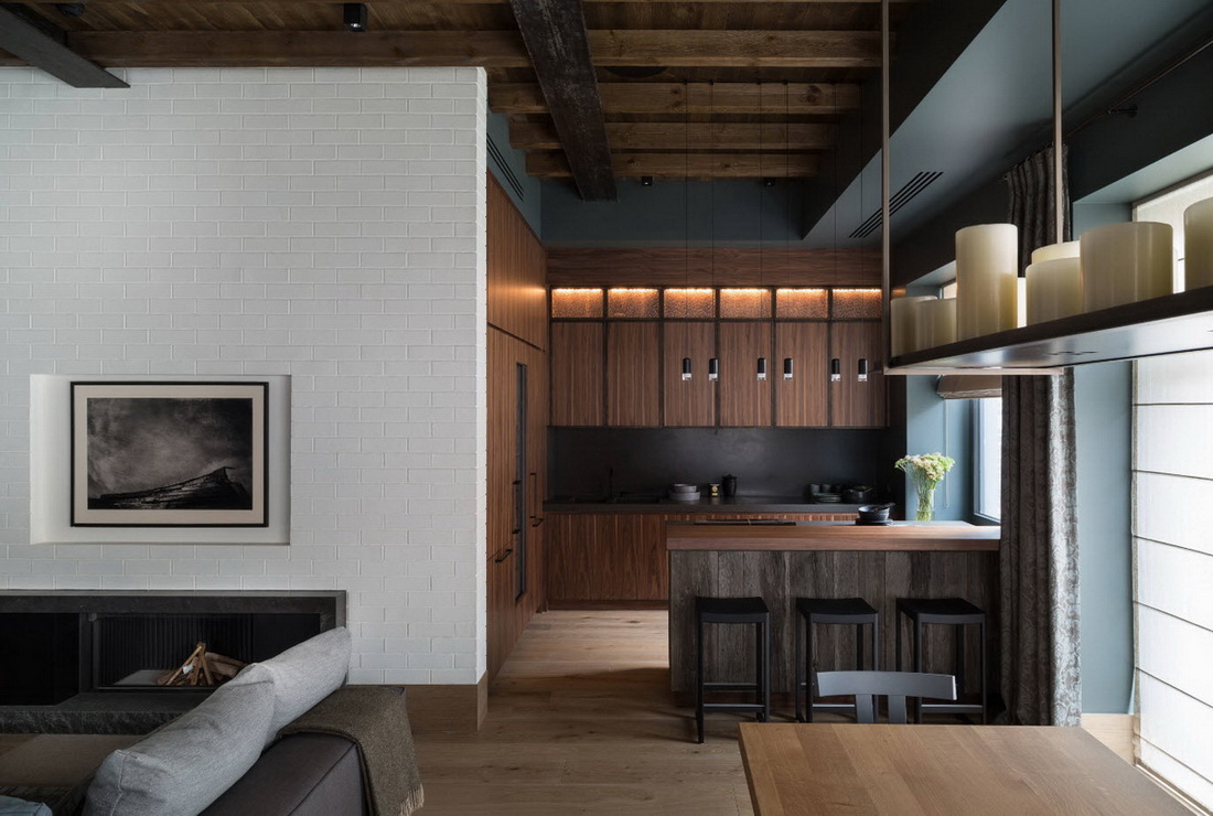 В кухне, оформленной в стиле лофт, самыми распространёнными останутся естественные кирпичные цвета, такие как-коричневый, черный, бело-серый, охристый.