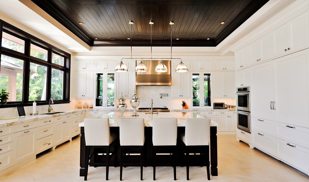 Потолки в кухонном помещении могут оставаться белыми, что позволит играть на контрасте при создании дизайна. Бело-красный тандем цветов остается одним из классических сочетаний тонов.