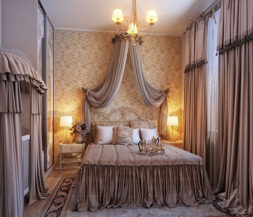 В спальне золотые обои послужат отличной базой для создания арт-деко, барроко, рококо, восточного стиля. Для легких и светлых интерьеров следует выбрать полотно со светлым фоном: белым, беж, пастельных тонов с золотым узором, дополняют их текстилем в тон основным цветам и мебелью, ее цвет лучше подбирать под стиль оформления.