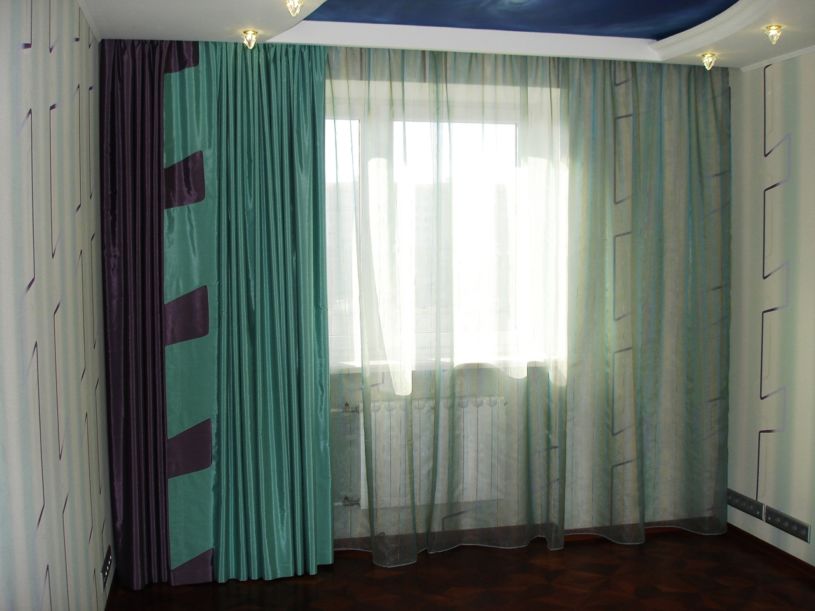 Если обои в помещении имеют однотонный цвет, они будут хорошо гармонировать с яркими, многочисленными рисунками на занавесках. Такие шторы можно дополнить однотонной тюлевой занавеской.