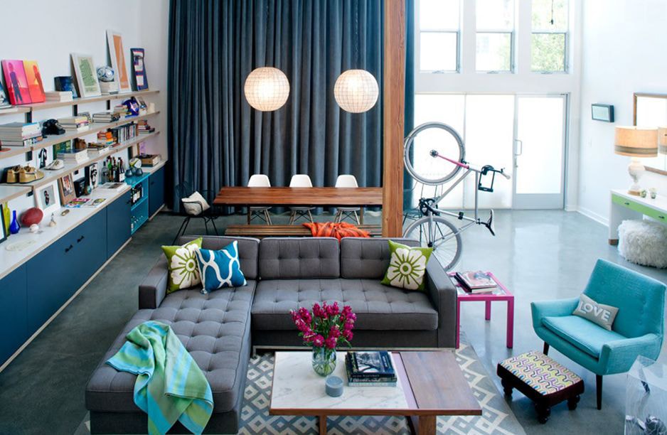 Зону отдыха также не нужно загромождать изобилием мебели, здесь достаточно дивана, пары кресел и журнального столика. Для функциональности пространства можно использовать настенные полки, телевизор также лучше повесить на одну из стен. Если же в гостиной приходится и спать, то лучше всего использовать раскладные модели диванов. Диван лучше всего располагать напротив телевизора таким образом, чтобы он был повернут к кухне спинкой. В качестве занавесок здесь лучше всего использовать прозрачные шторы, тюль или рулонные модели, которыми можно регулировать естественное освещение.